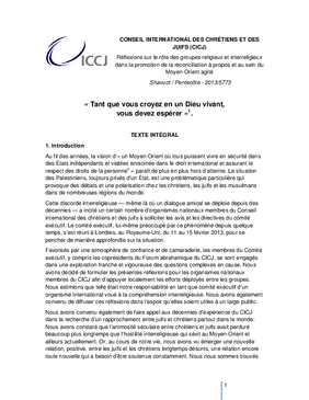 Réflexions sur le rôle des groupes religieux et interreligieux dans la promotion de la réconciliation à propos et au sein du Moyen-Orient agité. Shavuot / Pentecôte - 2013/5773